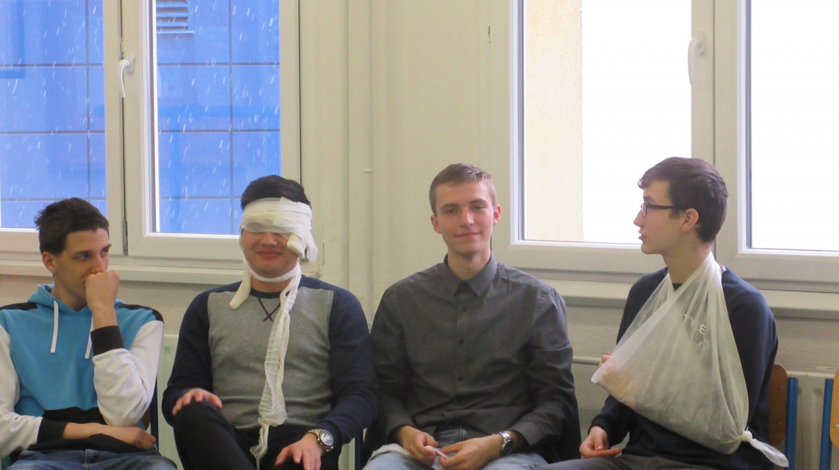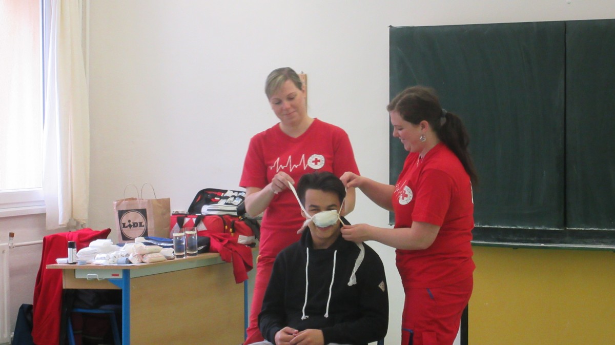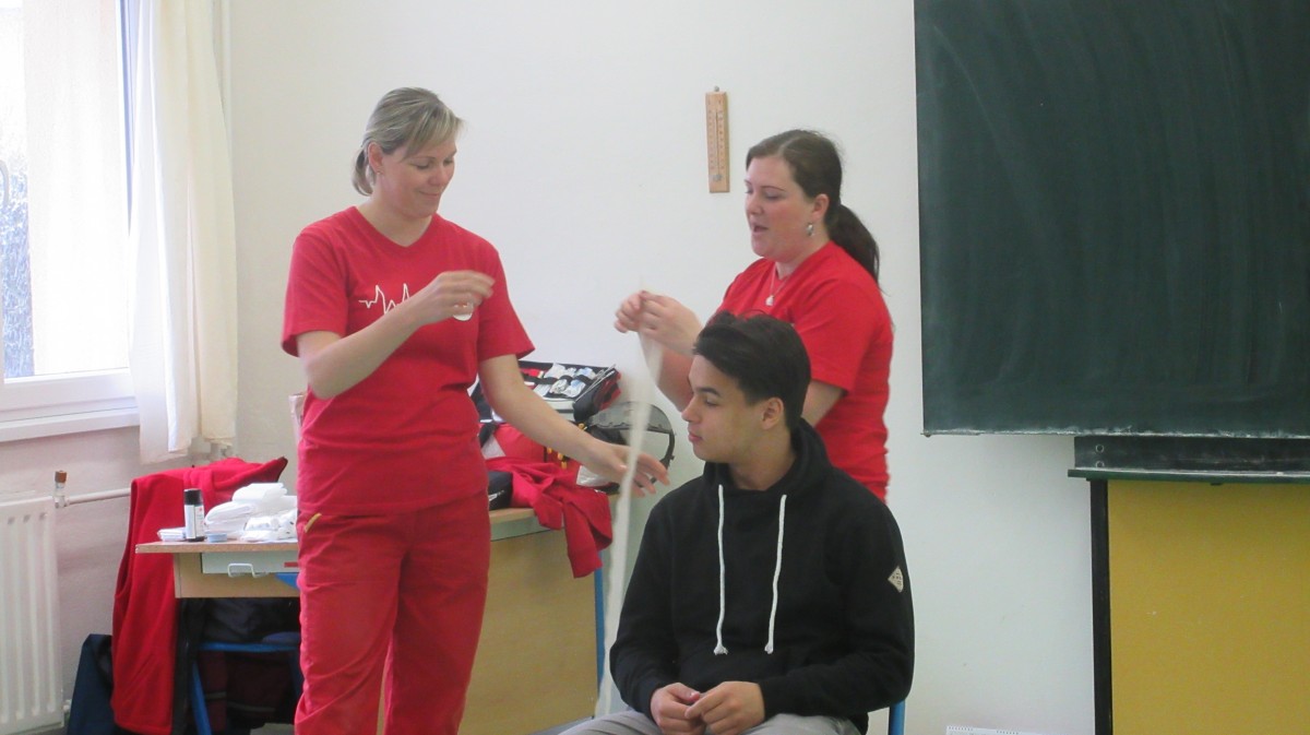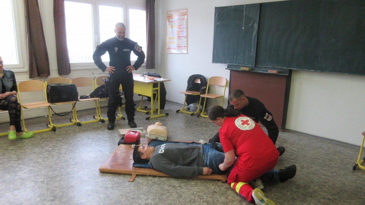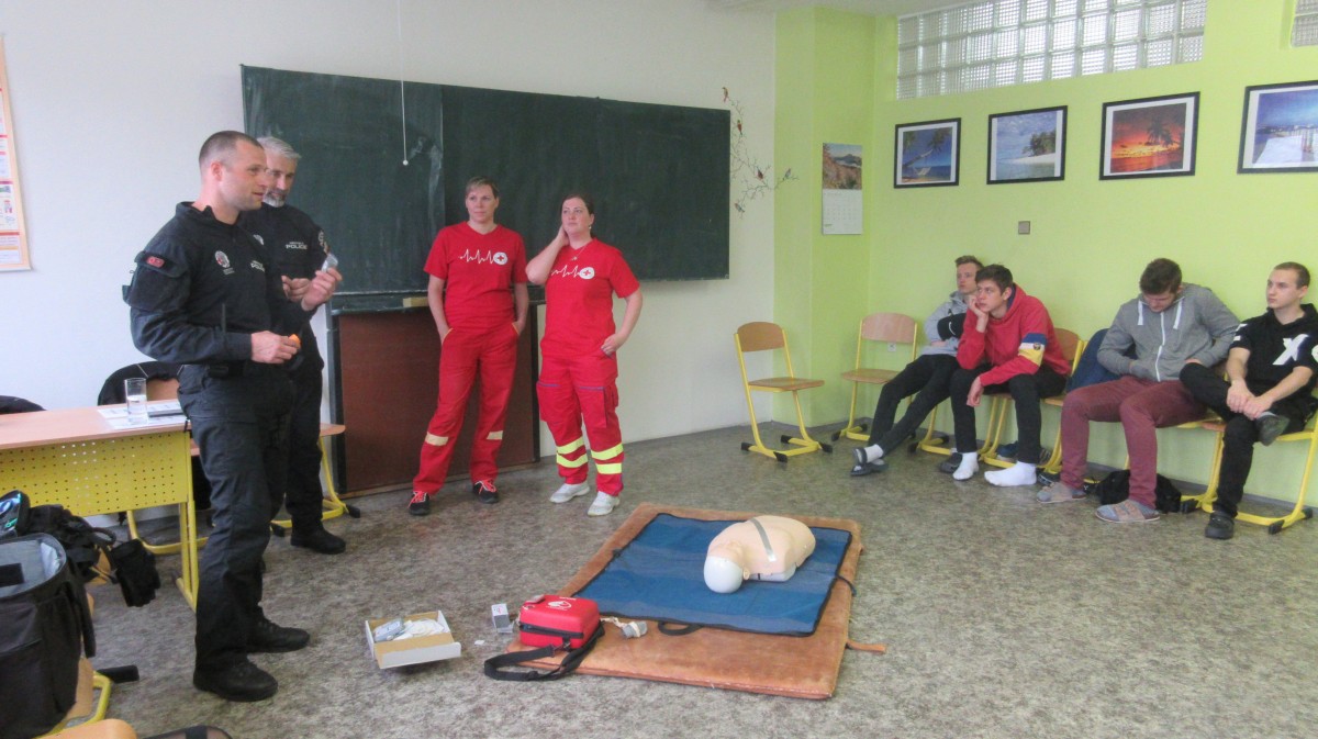 Jednotlivé třídy se svými učiteli postupně procházely šesti stanovišti. Na jednom z nich se seznamovali prostřednictvím pracovnic ČČK se zásadami první pomoci, což zní poměrně staticky, ale dámy v červeném dokázaly žáky zapojit do akce a prakticky všichni si vyzkoušeli nepřímou masáž srdce a další aktivity spojené se záchranou lidského života. Obdobnou činnost předváděli i zástupci MP Rožnov pod Radhoštěm, ale s jinými prostředky. Jejich stanoviště bylo neustále v obležení žáků, kteří o jejich práci projevili mimořádný zájem. Velmi zajímavou byla ukázka mobilního defibrilátoru. Každý, kdo měl možnost vyzkoušet na vlastní kůži práci záchranáře (naštěstí jen na figuríně), pochopil, o jak náročnou záležitost se jedná.